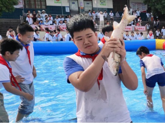 在学校操场上,充气游泳池注水放鱼,一场寓教于乐的捉鱼活动拉开帷幕。同学们在浅水区欢快捉鱼,笑声回荡校园。正如华山小学校长所说:“我们以知识为笔,绘就安全蓝图;以实践为墨,书写生命华章;以欢乐为纸,承载教育初心。在学??棺接慊疃?,既能满足学生们体验摸鱼的快乐,又能规避节假日私自下水摸鱼的危险,更让学生在趣味中巩固防溺水知识。”